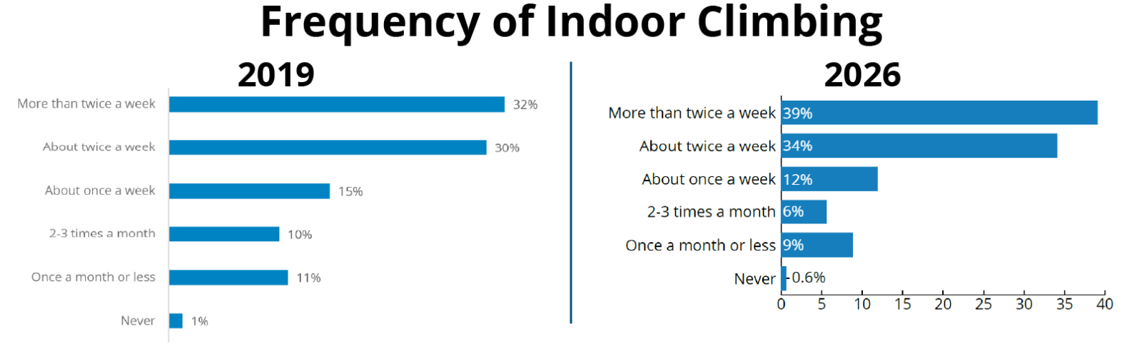 In 2019, about 60% of climbers reported climbing twice a week or more. By 2026, that number had climbed to nearly three-quarters. In other words, today’s climbers may still be relatively new, but they are integrating climbing more deeply into their weekly routines.
