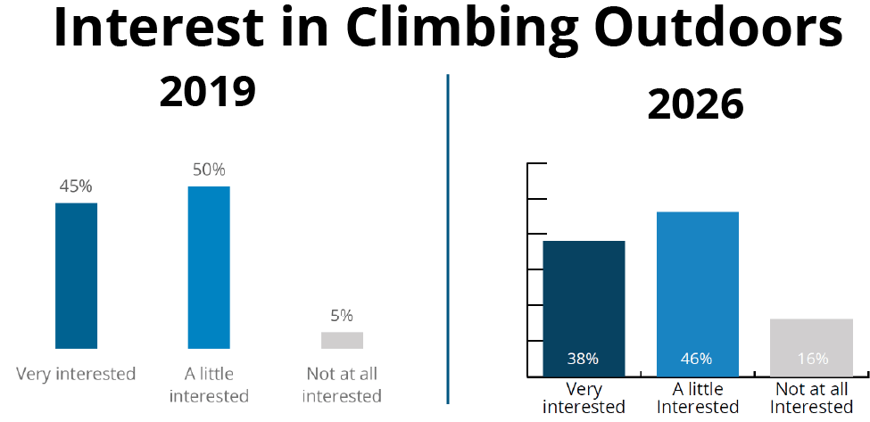 One of the most striking differences between 2019 and 2026 shows up in attitudes toward outdoor climbing.