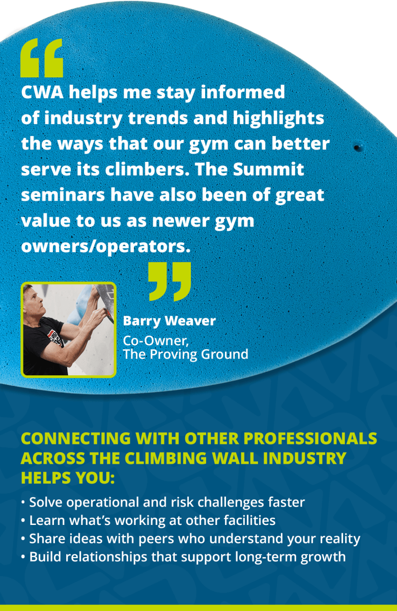 Welcome to the CWA, and thank you for being part of the community. Your membership strengthens both your team and the broader climbing wall industry.